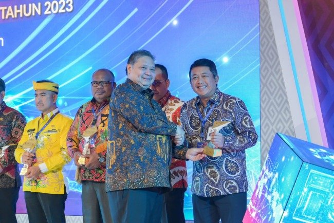Menteri Koordinator Bidang Perekonomian RI sekaligus Ketua Pengarah Satgas P2DD, Airlangga Hartarto (kiri) menyerahkan penghargaan kepada Direktur Teknologi dan Operasional, merangkap Pelaksana Tugas (Plt.) Direktur Utama Bank DKI, Amirul Wicaksono (kanan) sebagai BPD Terbaik Dalam Mendukung Kebijakan P2DD Tahun 2023, dalam acara Rapat Koordinasi Nasional Percepatan dan Perluasan Digitalisasi Daerah (P2DD) Tahun 2023, di Jakarta pada Selasa (3/10/2023).