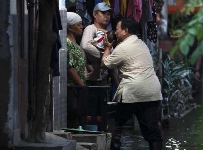 Prabowo lalu menyusuri area yang terendam banjir itu dan mendatangi rumah-rumah warga, di antaranya adalah warga yang memilih untuk tidak mengungsi.