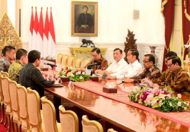 JAKARTA-Presiden Joko Widodo menerima pendiri dan pimpinan Softbank Masayoshi dan CEO Grab Anthony Tan di Istana Merdeka, Jakarta, Senin.